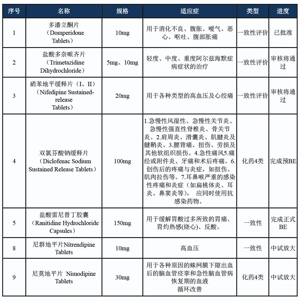 表 1:在研仿制藥制劑項目表
